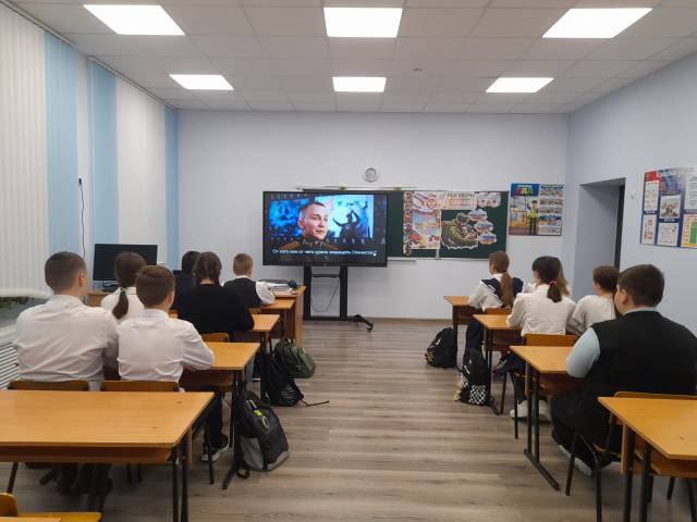 Обучающиеся посмотрели видеоинтервью с ветераном Великой Отечественный войны, фронтовым разведчиком, участником Парада Победы на Красной площади 24 июня 1945 года Константином Сергеевичем Федотовым и Героем Российской Федерации, участником СВО Николаем Андреевичем Соколовым.
