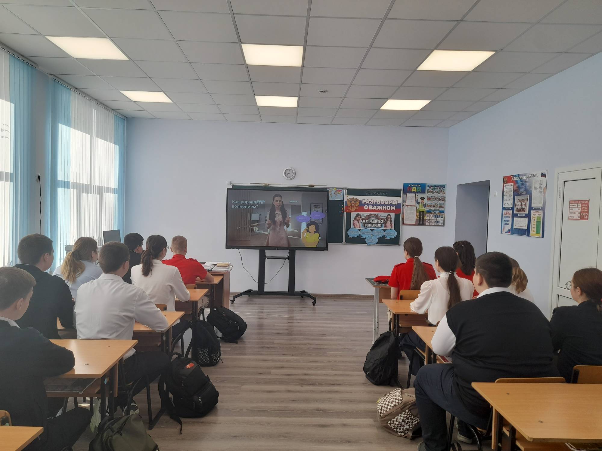 На линейке директор школы Калугина О. А. подвела итоги прошедшей недели и озвучила план работы на предстоящую неделю. После линейки все дружно разошлись по классам на очередное внеурочное занятие «Разговоры о важном» по теме «Как справляться с волнением?»