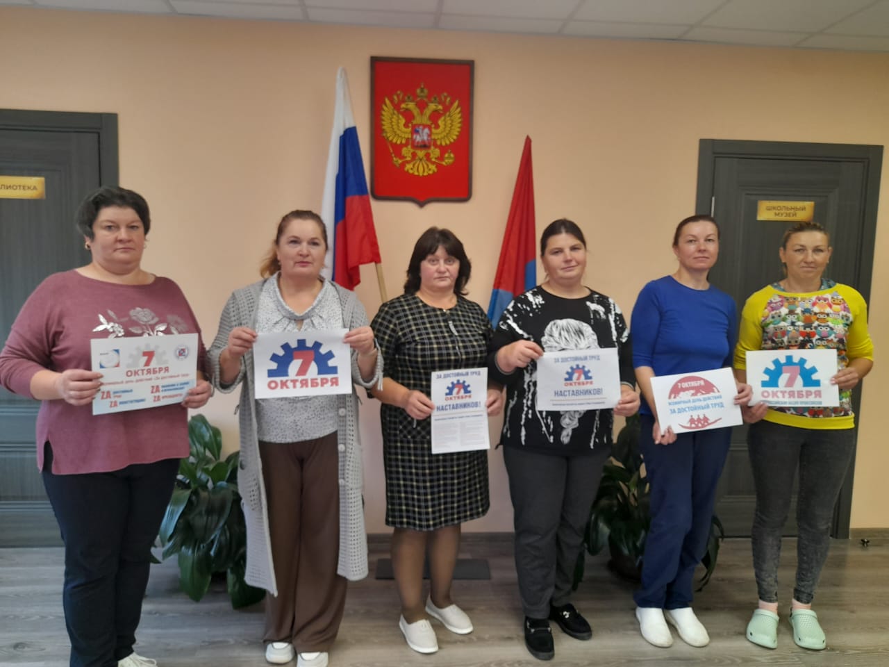 Сегодня 7 октября в Первичной профсоюзной организации нашей школы прошла акция в рамках Всемирного дня действий «За достойный труд!» под девизом "За достойный труд наставников!"