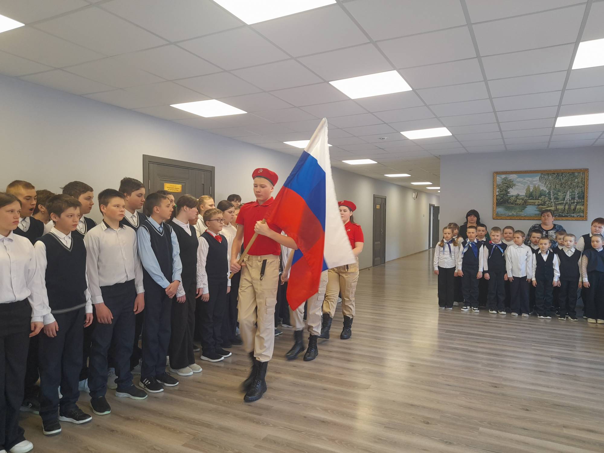 Утро понедельника традиционно началось с выноса государственного флага и исполнения гимна России . Эта традиция символизирует уважение к государственным символам и национальной культуре, а также формирует у школьников чувство патриотизма и гражданской ответственности.
