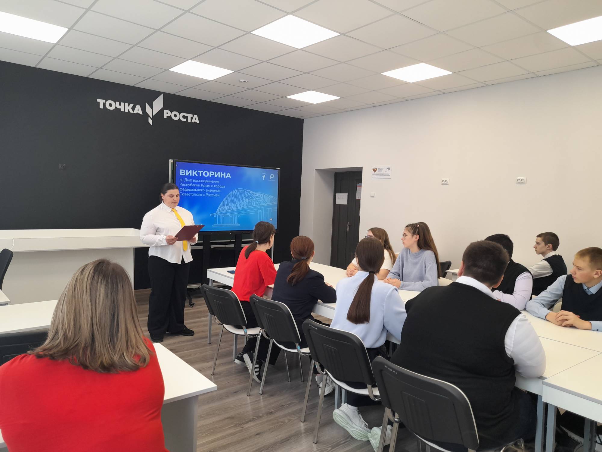 В преддверии этой даты, в нашей школе прошла познавательная викторина «Одна страна – одна история», разработанная совместно с Движением Первых. Советник директора по воспитанию и взаимодействию с детскими общественными объединениями Е.В.Федорова организовала для школьников мероприятие, посвященное изучению богатой и многогранной истории Крыма.
