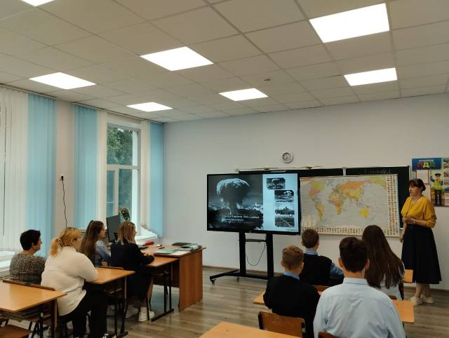 Именно этому событию в школе было посвящено мероприятие – Урок памяти «Последние залпы Великой войны». Цель мероприятия: укрепление исторических основ и патриотических традиций, сохранение исторической памяти о Победе во Второй мировой войне, увековечение достойной памяти погибших при защите Отечества. Учащиеся 7-10 классов вместе с учителями истории Глазковой О.В. и Федоровой Е.В. посмотрели презентацию, перелистали некоторые страницы Второй мировой войны: указали хронологические рамки, узнали про количество государств-участников и места боевых действий. Затем был просмотр короткометражного (документального) фильма/видеоролика ФГБУ «Роспатриотцентр», посвященного экспедиции на остров Шумшу.