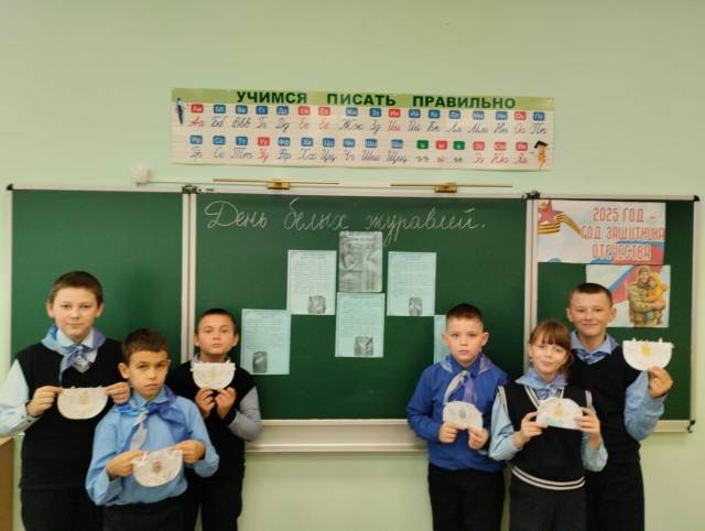Ребята узнали, почему именно белые журавли стали символом этого праздника. Их глубоко тронула трагическая судьба маленькой японки Садако Сасаки, ставшей жертвой последствий атомной бомбардировки Хиросимы и так и не успевшей сложить тысячу журавликов. Школьники узнали, что по всей России и в других странах установлены памятники, где журавли служат символом скорби по воинам, не вернувшимся с войны. Завершилось мероприятие минутой молчания.
